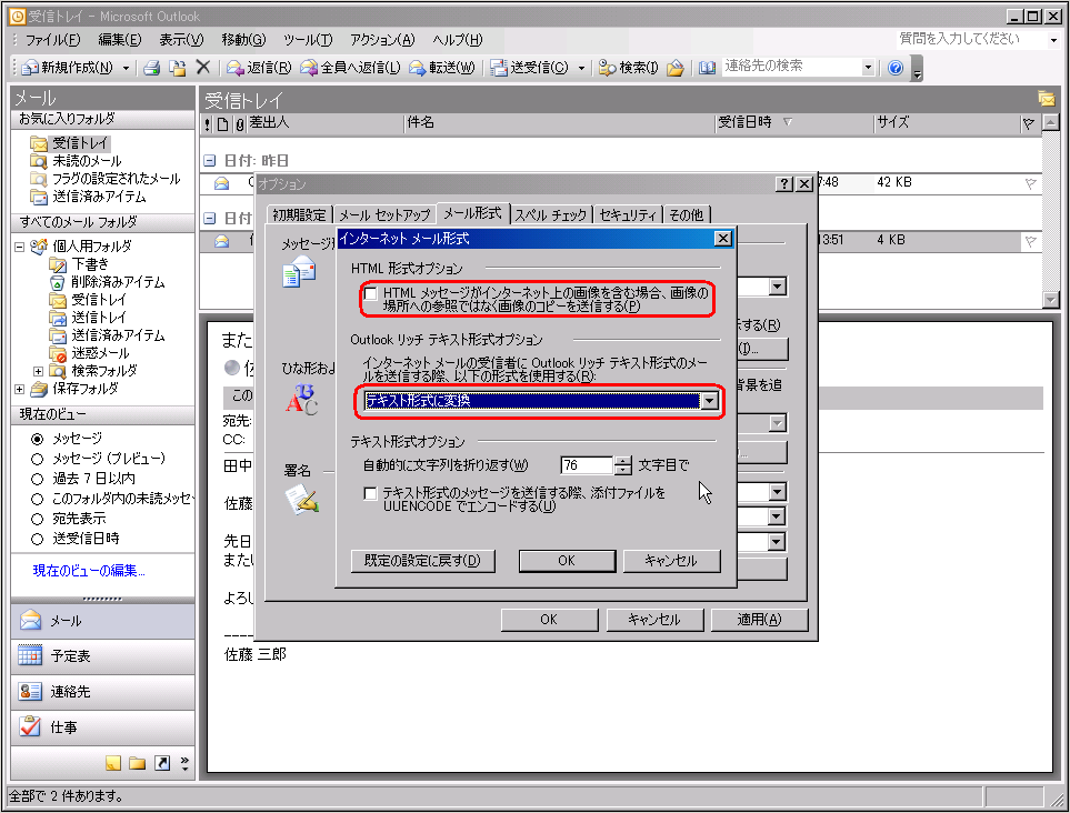 - 「全ての標準メールをテキスト形式で表示する」にチェックした場合、HTMLメール等を表示する際、「このメッセージはテキスト形式に変換されました」と表示される。