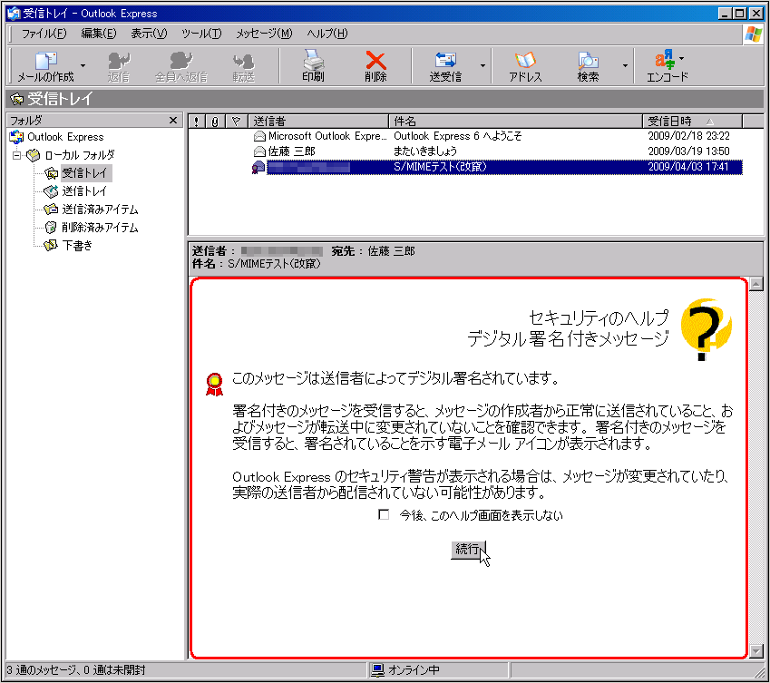 Microsoft Outlook Expressのメールアドレスの表示形式は、標準で「表示名」と「メールアドレス」の両方が表示され、変更できません。S/MIMEによる署名メールの表示例