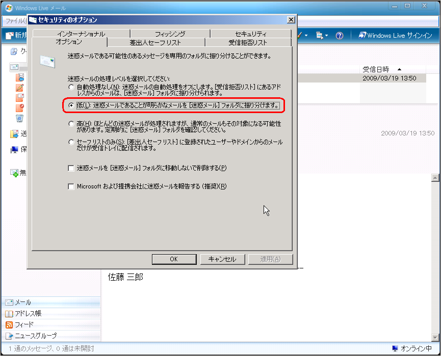 Microsoft Windows Live Mailは、標準でPGPをサポートしていません。迷惑メールフィルタの設定