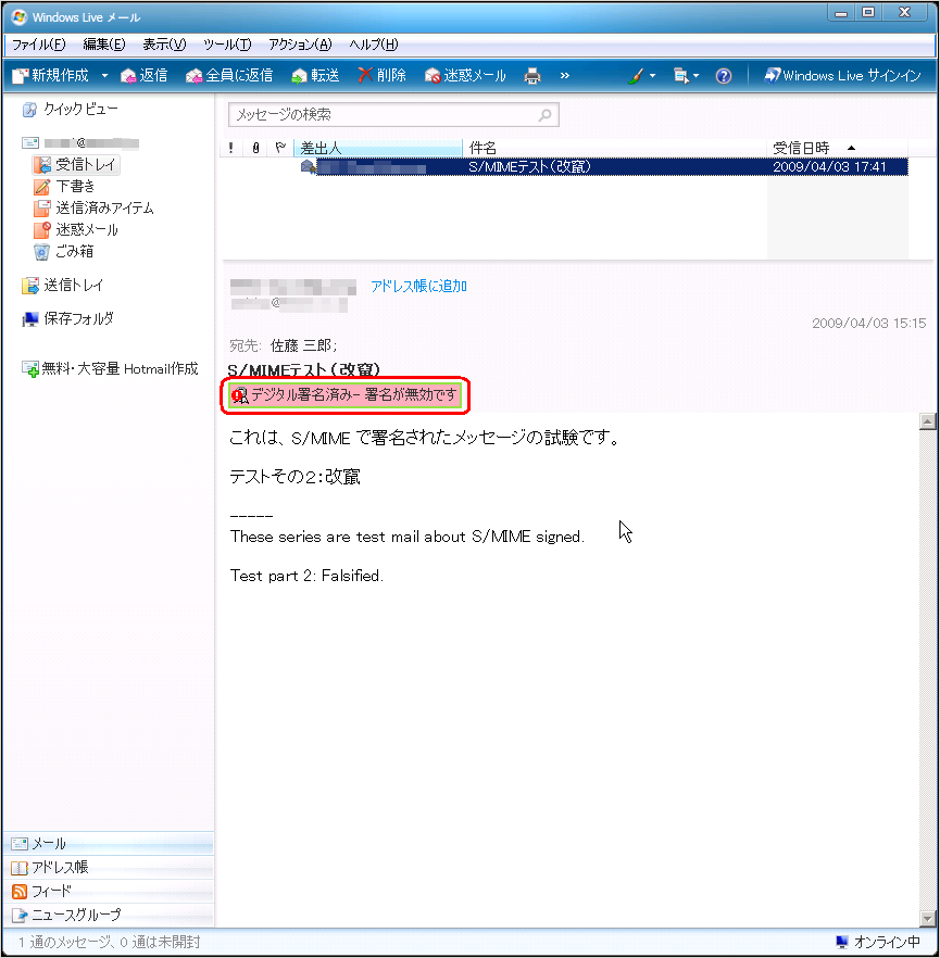 Microsoft Windows Live Mailのメールアドレスの表示形式は、標準で「表示名」と「メールアドレス」の両方を表示します。特別な設定は必要ありません。S/MIMEによる署名メールの表示例