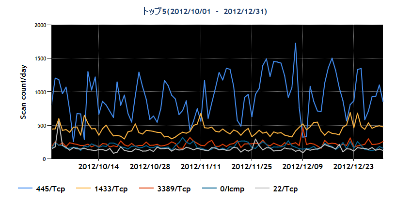 図1は期間中もっとも多く観測された5位までの宛先ポート番号(以下トップ5と記す)をもった観測パケット数の変化を示したものです。今四半期は、22/TCPの宛先ポート番号をもつパケット数が増加し、23/TCPに替わり5番目になりました。これについては「2. 注目された現象」で取り上げます。