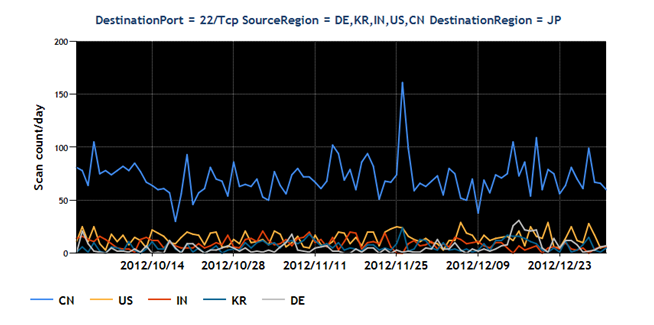 2.1 22/TCP 宛のパケットの増減22/TCP宛のパケットは、図1のグラフのように今期宛先ポート番号別で5番目に多くパケットを観測しました。図3は22/TCP宛パケットの送信元地域トップ5の変化を示したものです。米国や中国、インドなどの地域から観測しています。送信元地域のトップ5には含まれていませんが、国内の複数のIPアドレスを送信元としたパケットも観測されました。