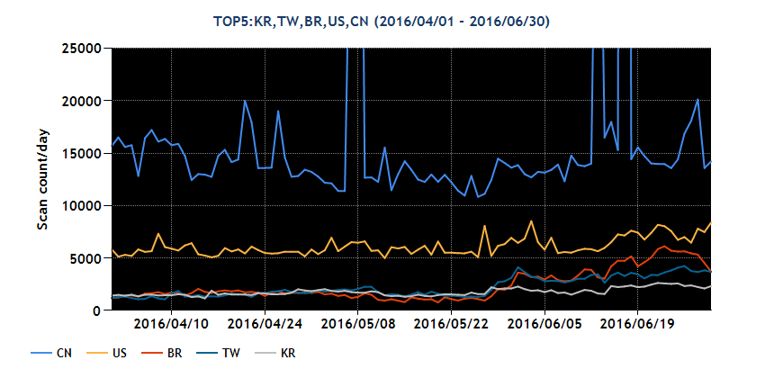 2.1 Port23/TCP宛のパケット数の増加2016年5月27日ごろより、Port23/TCP宛に対するパケット数の増加を観測しています。特定の地域に限らず複数の地域からのパケットが増加しています。( 図3 )